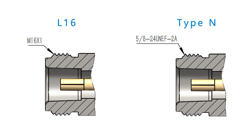L16 is Chinese connector product with similar dimension to Type N connector but different screw thread standards. Type N adopts inch screw thread standard 5/8-24UNEF while L16 adopts metric fine thread M16X1. See image below: